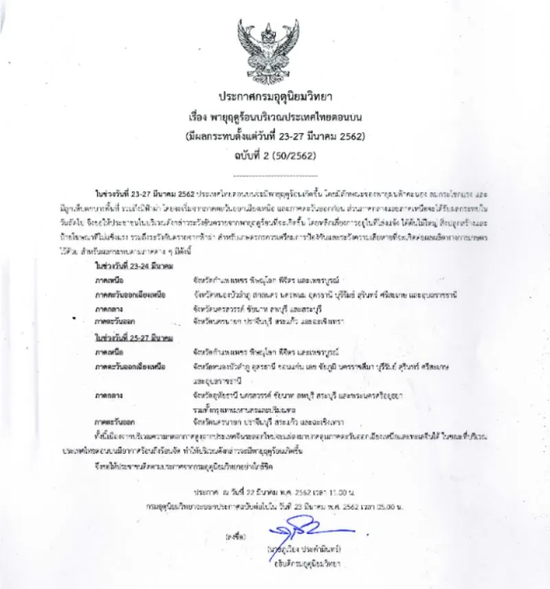 ในช่วงวันที่ 23-27 มีนาคม 2562 ประเทศไทยตอนบนจะมีพายุฤดูร้อนเกิดขึ้น โดยมีลักษณะของพายุฝนฟ้าคะนอง ลมกระโชกแรง และมีลูกเห็บตกบางพื้นที่ รวมถึงมีฟ้าผ่า โดยจะเริ่มจากภาคตะวันออกเฉียงเหนือ และภาคตะวันออกก่อน ส่วนภาคกลางและภาคเหนือจะได้รับผลกระทบในวันถัดไป จึงขอให้ประชาชนในบริเวณดังกล่าวระวังอันตรายจากพายุฤดูร้อนที่จะเกิดขึ้น โดยหลีกเลี่ยงการอยู่ในที่โล่งแจ้ง ใต้ต้นไม้ใหญ่ สิ่งปลูกสร้างและป้ายโฆษณาที่ไม่แข็งแรง รวมถึงระวังอันตรายจากฟ้าผ่า สำหรับเกษตรกรควรเตรียมการป้องกันและระวังความเสียหายที่จะเกิดต่อผลผลิตทางการเกษตรไว้ด้วย สำหรับผลกระทบตามภาคต่าง ๆ มีดังนี้