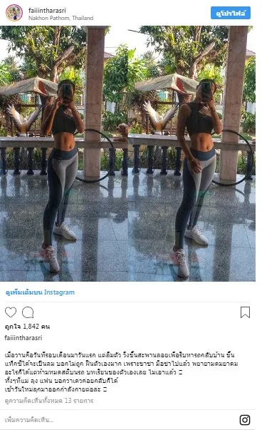 ฝ้ายอยากบอกกำลังทุกคนว่าเห็นหุ่นแบบนี้ในชีวิตไม่เคยเข้าฟิตเนสเลยค่ะ ฝ้ายเริ่มจากไม่มีอะไร จนเก็บเงินซื้อเสื่อโยคะเอง แอบเล่นในห้องคนเดียว จากนั้นก็มีเพื่อนเพิ่มคือดัมเบลกับฮูล่าฮูบ ฝ้ายเริ่มสร้างบ้านให้กลายเป็นฟิตเนสส่วนตัว จากที่ออกในห้องก็ย้ายมาออกหน้าบ้าน ใช้กระจกประตูบ้านดูฟอร์มการเล่นของตัวเอง ส่วนโค้ชนี่ตามในเน็ตเลยค่ะ ฝ้ายเริ่มรู้จักแบ่งเวลา จะเริ่มออกตอน 7.45- 9.45 น. จะอยู่ประมาณนี้