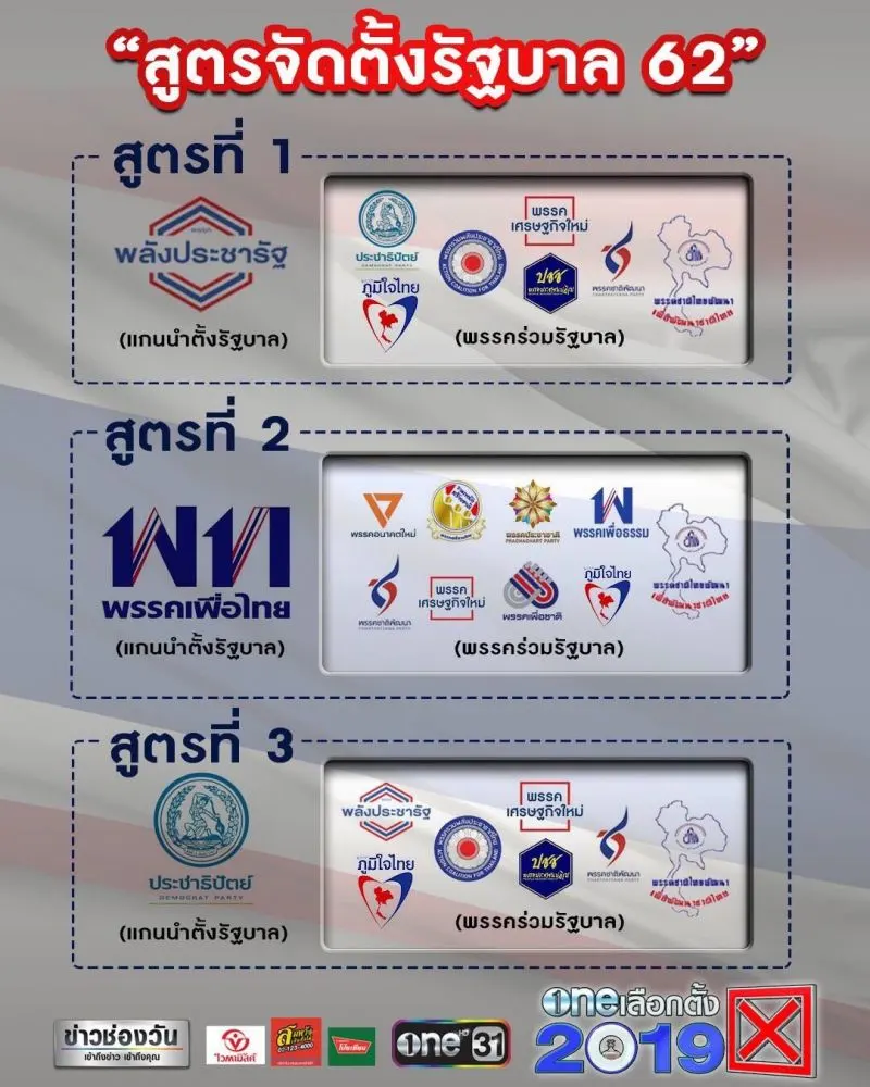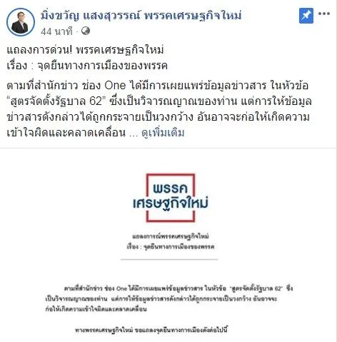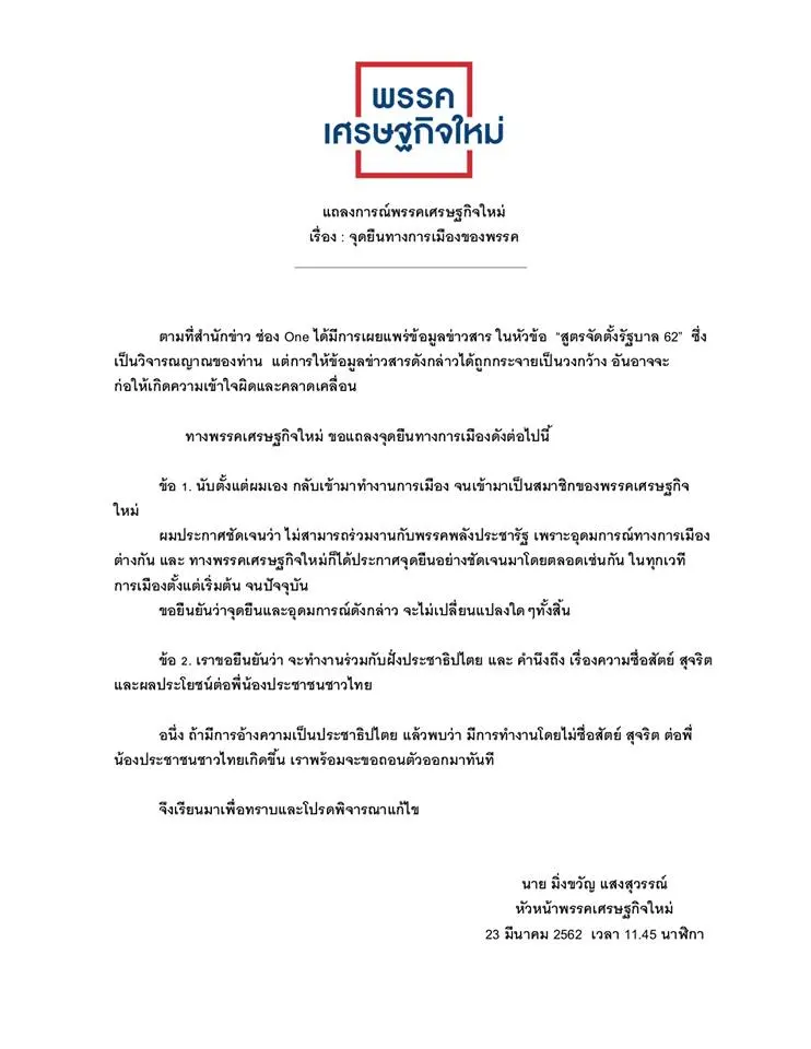 แถลงการ พรรคเศรษฐกิจใหม่ เรื่อง : จุดยืนทางการเมืองของพรรค ตามที่สำนักข่าว ช่อง One ได้มีการเผยแพร่ข้อมูลข่าวสาร ในหัวข้อ “สูตรจัดตั้งรัฐบาล 62” ซึ่งเป็นวิจารณญาณของท่าน แต่การให้ข้อมูลข่าวสารดังกล่าวได้ถูกกระจายเป็นวงกว้าง อันอาจจะก่อให้เกิดความเข้าใจผิดและคลาดเคลื่อน