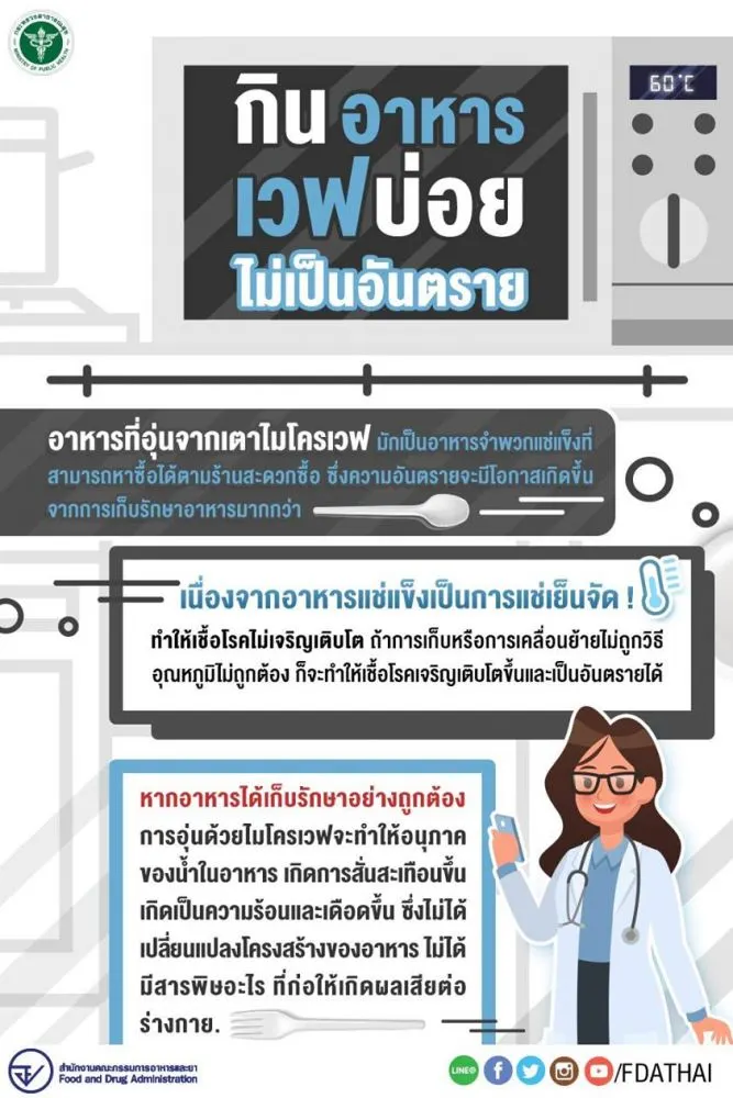 อาหารได้รับการเก็บรักษาอย่างถูกต้องแล้ว เมื่อนำมาอุ่นด้วยไมโครเวฟ จะทำให้อนุภาคของน้ำในอาหารเกิดการสั่นสะเทือนขึ้น เกิดเป็นความร้อนขึ้นมา โดยไม่ได้เปลี่ยนแปลงโครงสร้างของอาหาร ... จึงไม่ได้ทำให้เกิดสารพิษ หรือก่อให้เกิดผลเสียต่อร่างกาย