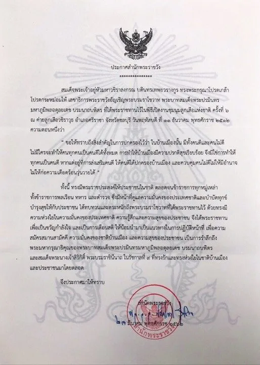 โดยมีเนื้อตามประกาศสำนักพระราชวัง เมื่อเวลาโดยประมาณ 23นาฬิกา