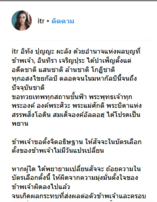 เชื่อว่าเช้าของวันนี้หลายๆคนคงมุ่งหน้าเพื่อไปใช้สิทธิ์ใช้เสียงในการเลือกตั้งประชาชนจำนวนมากรวมถึงเหล่านักแสดงอย่าง สาวทราย เจริญปุระ ที่ล่าสุดนี้ ก็ได้ไปใช้สิทธิ์เลือกตั้งพร้อมกับโพสต์ภาพลงเฟสบุ๊คพร้อมระบุข้อความตั้งจิตอธิษฐานถึงคนที่เปลี่ยนบัตรเลือกตั้งว่า อิทัง ปุญญะ ผะลัง ด้วยอำนาจแห่งผลบุญที่ข้าพเจ้า, อินทิรา เจริญปุระ ได้บำเพ็ญตั้งแต่อดีตชาติ แสนชาติ ล้านชาติ โกฏิชาติ ทุกอสงไขยกัลป์ ตลอดจนในมหากัลป์นี้จนถึงปัจจุบันชาติ ขอทวยเทพทุกสถานชั้นฟ้า พระพุทธเจ้าทุกพระองค์ องค์พระศิวะ พระแม่ศักติ พระบิดาแห่งสรรพสิ่งโอดิน สมเด็จองค์อัลลอฮฺ ได้โปรดเป็นพยาน ข้าพเจ้าขอตั้งจิตอธิษฐาน ให้สัจจะในบัตรเลือกตั้งของข้าพเจ้าไม่มีวันแปรเปลี่ยน หากผู้ใด ได้พยายามเปลี่ยนสัจจะ ถ้อยความในบัตรเลือกตั้งนี้ ให้ผิดจากความมุ่งมั่นตั้งใจของข้าพเจ้าผิดลงไปแล้ว จนเกิดผลกระทบที่ส่งผลต่อตัวข้าพเจ้าและครอบครัว ก็ขอให้ผลกรรมกลับไปสู่ มันผู้นั้นและครอบครัวสืบชั่วลูกชั่วหลาน ไม่ว่าไปแห่งหนตำบลใดที่ได้เหยียบย่ำบนแผ่นดินก็ขอให้พระแม่ธรณีและสิ่งศักดิ์สิทธิ์เทวดาฟ้าดินอย่าได้คุ้มครอง ไปจนกว่าพวกมันจะสำนึกได้ อินทิรา, กระทรวงเวทมนตร์ โดยมีคนมาขอลอกเลียนแบบบ้าง รวมทั้งวีเจจ๋า ณัฐฐาวีรนุช ถึงกับเข้ามาคอมเมนต์บอกด้วยว่า อันนี้ใช้ได้จริงไหม? จะได้ลอก ซึ่งสาวทราย ก็มาตอบว่า ได้จริง ปรึกษากับผู้นำทางจิตวิญญาณประจำตัวเรามาแล้ว จ๋าเอาไปใช้ก็เปลี่ยนจากชื่อเราเป็นชื่อจ๋าเลย