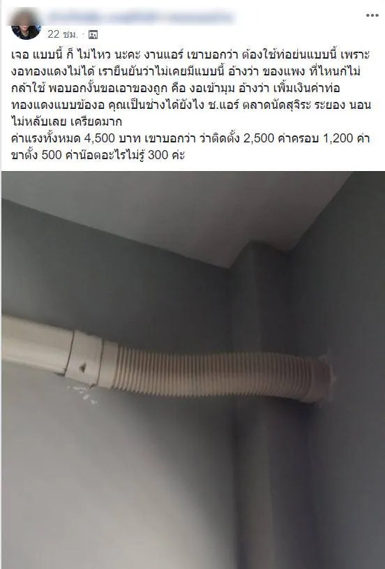 สาวโพสต์โวย!! ช่างคิดค่าแรงแพง แต่คุณภาพงานโคตรห่วย "เจอ แบบนี้ ก็ ไม่ไหว นะคะ งานแอร์ เขาบอกว่า ต้องใช้ท่อย่นแบบนี้ เพราะงอทองแดงไม่ได้ เรายืนยันว่าไม่เคยมีแบบนี้ อ้างว่า ของแพง ที่ไหนก้ไม่กล้าใช้ พอบอกงั้นขอเอาของถูก คือ งอเข้ามุม อ้างว่า เพิ้มเงินค่าท่อทองแดงแบบข้องอ คุณเป็นช่างได้ยังไง ช.แอร์ ตลาดนัดสุจิระ ระยอง นอนไม่หลับเลย เครียดมาก ค่าแรงทั้งหมด 4,500 บาท เขาบอกว่า ว่าติดตั้ง 2,500 ค่าครอบ 1,200 ค่า ขาตั้ง 500 ค่าน๊อตอะไรไม่รู้ 300 ค่ะ"