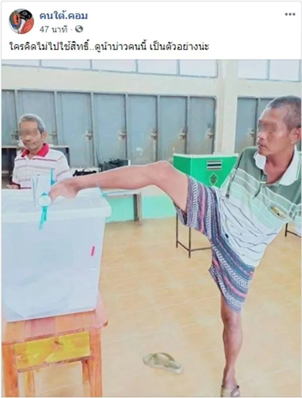 ในวันนี้(24 มี.ค 62) หลายคนออกมาใช่สิทธิ์ใช้เสียงเลือกตั้งกันตั้งแต่เปิดคูหา หลังจากที่รอคอยการเลือกตั้งมาเป็นเวลายาวนาน และวันนี้ทุกเสียงจึงมีความสำคัญอย่างยิ่ง ทั้งนี้ทางเพจ “คนใต้.คอม” ได้มีการโพสต์ภาพชายคนหนึ่งโดยทางเพจระบุแคปชั่นโพสต์นี้ว่า “ใครคิดไม่ไปใช้สิทธิ์..ดูน้าบ่าวคนนี้ เป็นตัวอย่างน่ะ”