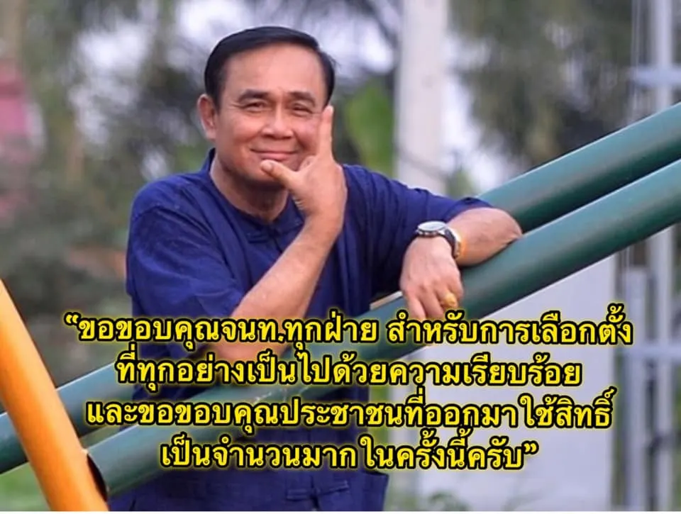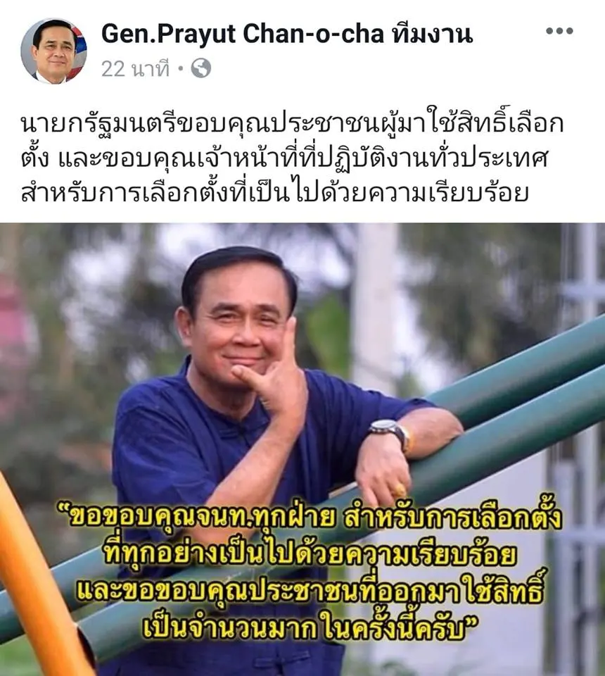 25 มี.ค. 2562 ความเคลื่อนไหวหลังการเลือกตั้งเช้านี้ เพจเฟซบุ๊คทีมงานฯ Gen.Prayut Chan-o-cha ทีมงาน โพสต์ภาพนายกรัฐมนตรี ขอบคุณประชาชนผู้มาใช้สิทธิ์เลือกตั้งและเจ้าหน้าที่ปฏิบัติงานทั่วประเทศ สำหรับการเลือกตั้งที่เป็นไปด้วยความเรียบร้อย