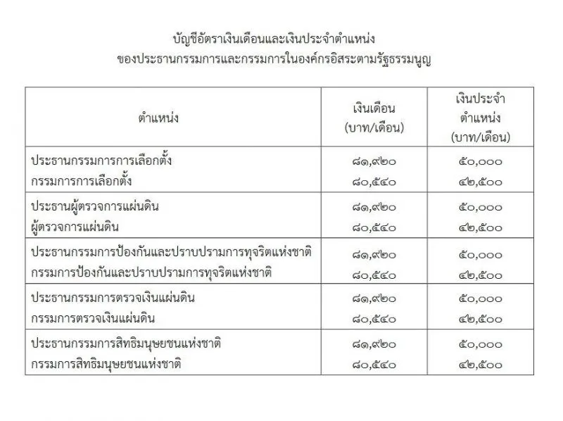 1.ประธานกรรมการการเลือกตั้ง และกรรมการการเลือกตั้ง 2.ประธานผู้ตรวจการแผ่นดินผู้ตรวจการแผ่นดิน 3.ประธานกรรมการป้องกันและปราบปรามการทุจริตแห่งชาติ กรรมการป้องกันและปราบปรามการทุจริตแห่งชาติ 4.ประธานกรรมการตรวจเงินแผ่นดิน กรรมการตรวจเงินแผ่นดิน และ 5.ประธานกรรมการสิทธิมนุษยชนแห่งชาติ กรรมการสิทธิมนุษยชนแห่งชาติ รวมอยู่ที่ 123,040 -131,920 บาท (ดูตาราง)