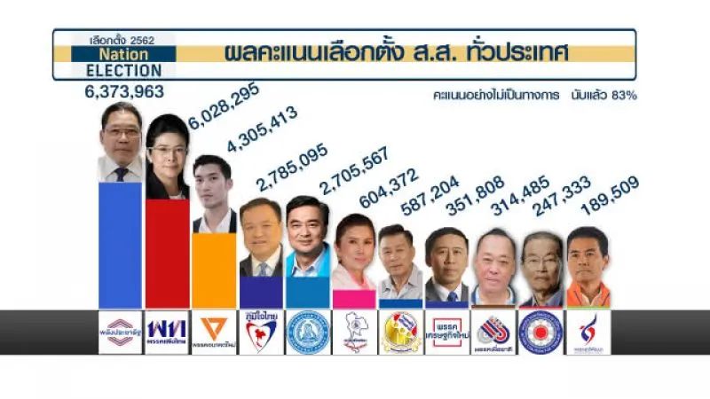 และผ่านไปร่วม 3 ชั่วโมงหลังการปิดหีบเลือกตั้ง ในภาพรวมคะแนนผู้สมัคร ส.ส. ทั่วประเทศ นับแล้ว 83% พรรคพลังประชารัฐนำโด่ง ด้วยคะแนน 6,373,963 รองลงมา พรรคเพื่อไทย ได้คะแนน 6,028,295 ส่วนพรรคพลังประชารัฐ อนาคตใหม่มาแรงด้วยคะแนน 4,305,413 ภูมิใจไทยเกินคาดแซงประชาธิปัตย์ 2,785,095