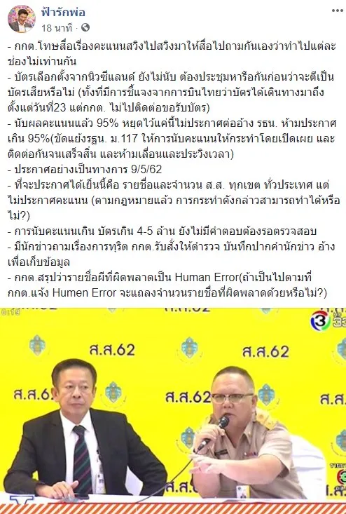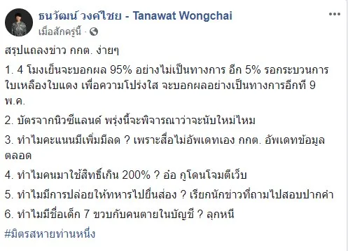กกต. เลื่อนแถลงสรุปผลการเลือกตั้งอย่างไม่เป็นทางการ 95% เป็นเวลา 16.00 น.ผ่านเว็บไซต์กกต.