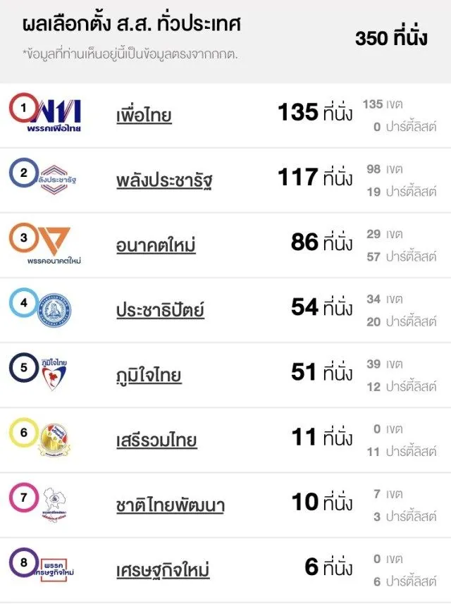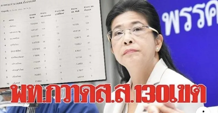 กวาด130ที่นั่ง! เพื่อไทยชนะเลือกตั้ง ส.ส.แบบแบ่งเขต