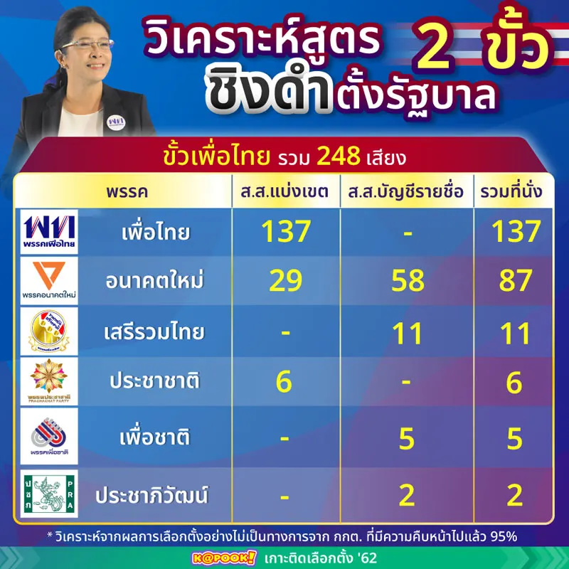 และพรรคอนาคตใหม่ ส.ส. 87 ที่นั่ง แซงพรรคประชาธิปัตย์ ซึ่งคว้าที่นั่ง ส.ส. ได้เพียง 55 ที่นั่งเท่านั้น ไม่เพียงผลคะแนนเท่านั้นที่สังคมให้ความสนใจ แต่ทิศทางการจัดตั้งรัฐบาลของ 2 พรรคใหญ่ก็เป็นเรื่องที่หลายคนกำลังจับตา ถึงจะไม่มีพรรคไหนออกมาเคลื่อนไหว เผยสูตรตั้งรัฐบาล แต่รายงานข่าวแจ้งว่า พรรคอันดับหนึ่งและสอง ทั้งคู่ได้มีการต่อสายตรงหาพันธมิตรกันเรียบร้อยแล้ว ซึ่งหากพิจารณาจากผลคะแนนและจำนวนที่นั่ง ส.ส. อย่างไม่เป็นทางการของ กกต. ก็สามารถวิเคราะห์การจับขั้วตั้งรัฐบาลของ 2 พรรคนี้ได้ไม่ยาก