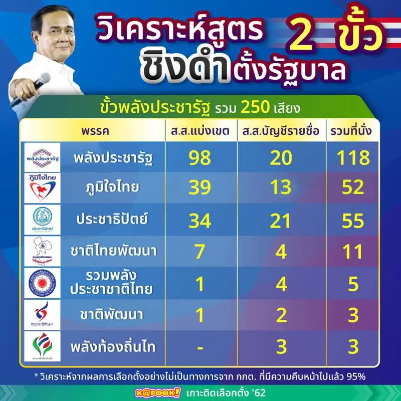เมื่อพรรคพลังประชารัฐ 250 เสียง ปะทะ พรรคเพื่อไทย 248 เสียง ใครจะชนะต้องจับตา เพราะนี่เป็นเพียงการวิเคราะห์อ้างอิงจากผลการเลือกตั้งอย่างไม่เป็นทางการจาก กกต. ที่มีความคืบหน้าไปแล้ว 95 เปอร์เซ็นต์ ถ้าจะให้ชัวร์ พรรคส่วนใหญ่พูดเป็นเสียงเดียวกันว่า ต้องให้ผลที่นั่ง ส.ส.จาก กกต. ครบ 100 เปอร์เซ็นต์ก่อน