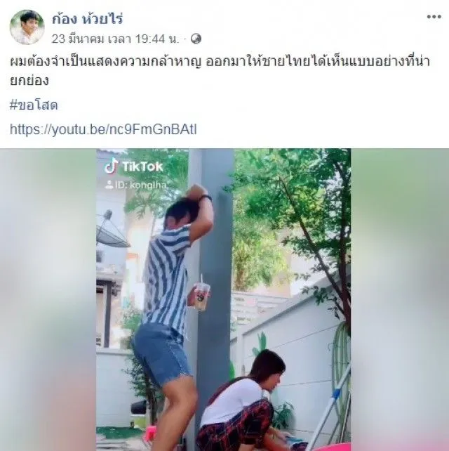ถือเป็นอีกหนึ่งนักร้องลูกทุ่งขวัญใจของใครหลายๆคนสำหรับ หนุ่มก้อง ห้วยไร่ เจ้าของผลงานเพลงเพราะมากมายที่สร้างผลงานโด่งดังมาแล้วนับไม่ถ้วน หลายๆคนคงทราบดีว่า หนุ่มก้อง เพิ่งจูงมือแฟนสาว เบลล์ เข้าประตูวิวหา์ไปเมื่อไม่นานมานี้ท่ามกลางความยินดีและเสียงวิพากษ์วิจารณ์ ล่าสุดนี้ หนุ่มก้อง ได้โพสต์คลิปวิดีโอเต้น เต้นกวนโอ๊ยเมียขณะที่สาวเบลกำลังนั่งซักรองเท้าอยู่พร้อมระบุข้อความว่า ผมต้องจำเป็นแสดงความกล้าหาญ ออกมาให้ชายไทยได้เห็นแบบอย่างที่น่ายกย่อง งานนี้สาวเบลถึงกับเข้ามาคอมเมนต์ว่า ฐา ขนิษ ไม่ชอบสิ่งนี้ แถมแฟนคลับยังเข้ามาคอมเมนท์อีกมากมาย จะกวนขนาดไหนนั้นไปดูคลิปกันเลยค่ะ