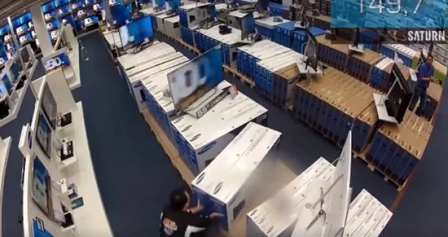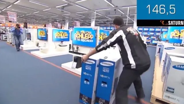 เขาวิ่งตรงไปที่โซนขายจอโทรทัศน์ LED ซัมซุงในทันที และลากเอาทีวี LED 55 นิ้ว UHD ออกมา 2 เครื่อง