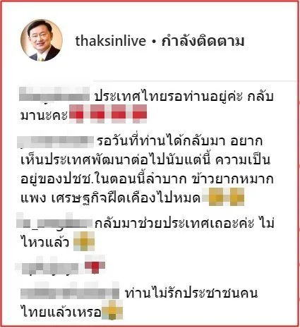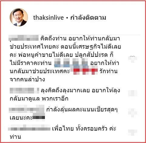 มีประชาชนคนไทยจำนวนไม่น้อย เข้าไปถล่มคอมเม้นต์ไอจีของ ทักษิณ ชินวัตร อดีตนายกรัฐมนตรี วอนขอให้กลับมายังประเทศไทย เพื่อช่วยเหลือประเทศไทย และเข้าไปตัดพ้อถึงการเมืองไทยในปัจจุบัน หลายคนเข้าไปบอกว่าคิดถึงและเฝ้ารอคอยให้กลับมา