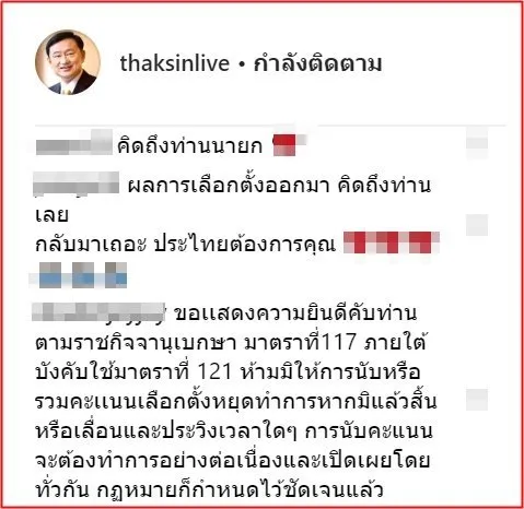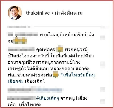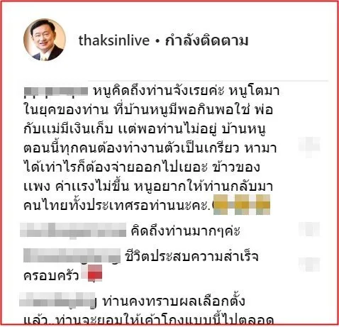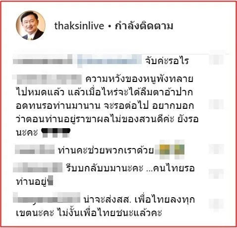ทักษิณ โดนคนไทย คอมเม้นในไอจี หลังการเลือกตั้งแล้วเสร็จ "ประเทศไทยรอท่านอยู่ค่ะ"