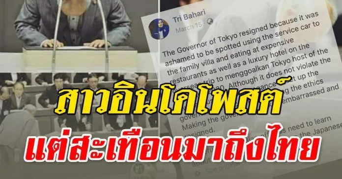 เรื่องที่โพสต์ คือ ผู้ว่าเมืองโตเกียวลาออก ด้วยถูกพบว่าได้ใช้รถราชการไปในการส่วนตัวครอบครัว และกินอาหารในภัตตาคารแพง พักโรงแรมหรู