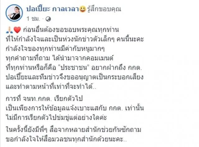 ก่อนอื่นต้องขอขอบพระคุณทุกท่าน ที่ให้กำลังใจ และเป็นห่วงนักข่าวตัวเล็กๆ คนนี้นะคะ กำลังใจของทุกท่านมีค่ากับหนูมากๆทุกคำถามที่ถาม ได้นำมาจากคอมเมนต์ ที่ทุกท่านหรือก็คือ ประชาชน อยากฝากถึง กกต. ปอเปี๊ยะ และทีมข่าวจึงขออนุญาตเป็นกระบอกเสียง และทำตามหน้าที่เท่าที่จะทำได้การที่ จนท.กกต. เรียกตัวไป เป็นเพียงการให้ข้อมูลแจ้งเบาะแสกับ กกต. เท่านั้น ไม่มีการเรียกตัวไปข่มขู่แต่อย่างใดค่ะ ในครั้งนี้ยังมีพี่ๆ สื่อจากหลายสำนักช่วยกันซักถาม ขอกำลังใจให้สื่อมวลชนทุกสำนักด้วยนะคะ