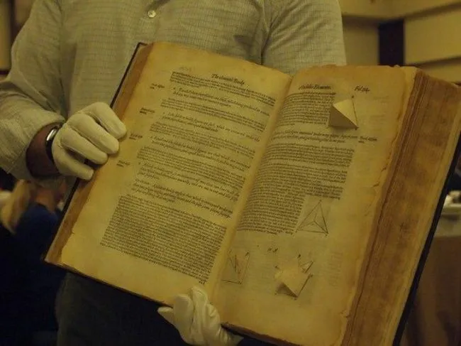 1 หนังสือเรียนเรขาคณิตที่ทำออกมาเป็น 3 มิติ โดยมีกระดาษยื่นออกมาให้เห็นเป็น 3 มิติอย่างชั้นเจน ที่ทำในสมัยก่อนตั้งแต่ ปีค.ศ. 1570