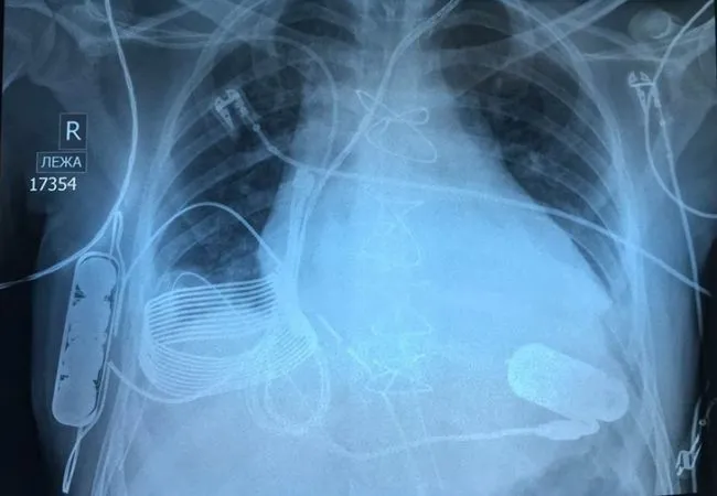 11 การเอ็กซ์เรย์หน้าอกของคนที่มีหัวใจเทียม (bionic heart) ที่กำลังชาร์ตแบบไร้สาย