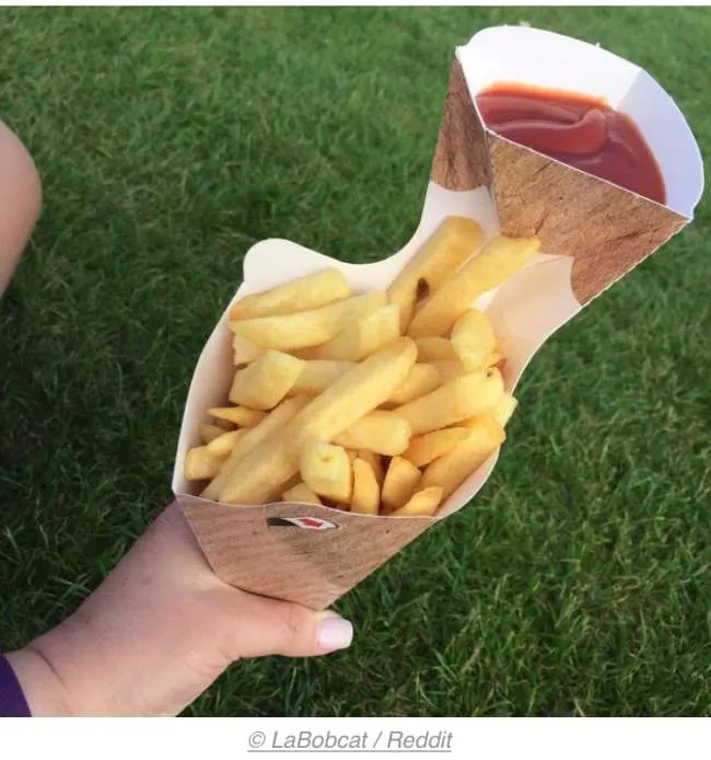 2 ทุกครั้งที่เรากินเฟรนด์ฟราย เราต้องหาซองใส่ซอสและบีบเพื่อกินมันเข้าไป แต่บรรจุภัณฑ์ของเฟรนด์ฟรายร้านนี้มีกระดาษแยกอีกมาอีกนิดนึงเป็นที่ใส่ซอสมะเขือเทศเพื่อให้คุณกินง่ายขึ้น