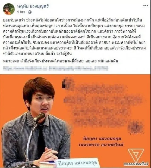 ยอมรับเลยว่า ช่วงหลัง ไม่ค่อยสนใจข่าวการเมืองมากนัก แต่เมื่อ 2 วันก่อนเดินเข้าไปในห้องนอนคุณพ่อ เห็นคุณพ่อดูข่าวการเมือง ได้เห็นนายปิยบุตร แสงกนกกุล บรรยายแนวความคิดที่รุนแรงเกี่ยวกับสถาบันหลักของชาติ อุ๊ตกใจมาก และคิดว่า การวิพากษ์ที่บิดเบือนรุนแรงนี้ เป็นอันตรายต่อความมั่นคงของชาติเป็นอย่างมาก