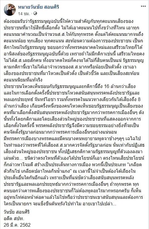 เรียกว่าเป็นการเมืองสองขั้วที่ถกกันไม่จบจริงๆ เพราะถึงแม้ว่าวันนี้พรรคเพื่อไทยจะมีการแถลงการณ์จัดตั้งรัฐบาล แต่ทนายวันชัยก็ได้ออกมาโพสต์ผ่านเฟซบุ๊กว่า พรรคพลังประชารัฐ มีสิทธิิที่ชอบธรรมจัดตั้งรัฐบาล โดยมีการโพสต์บรรยายเหตุผลยาวเหยียด เราไปอ่านพร้อมๆกันเลยค่า