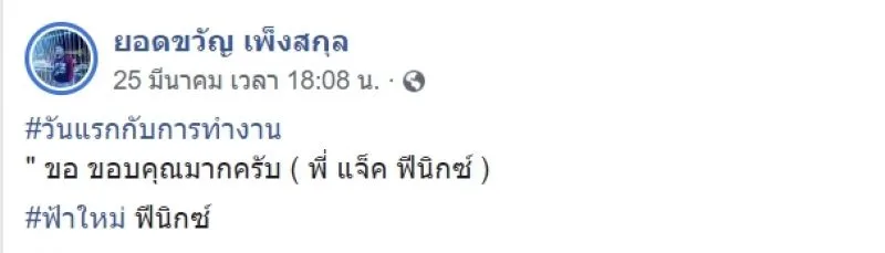 ล่าสุด ด้าน นายยอดขวัญ ก็ได้โพสต์ภาพพร้อมข้อความผ่านเฟซบุ๊กชื่อ "ยอดขวัญ เพ็งสกุล" ด้วยเช่นกันระบุว่า #วันแรกกับการทำงาน "ขอขอบคุณมากครับ (พี่ แจ็ค ฟีนิกซ์) #ฟ้าใหม่ ฟีนิกซ์ และอีกข้อความว่า