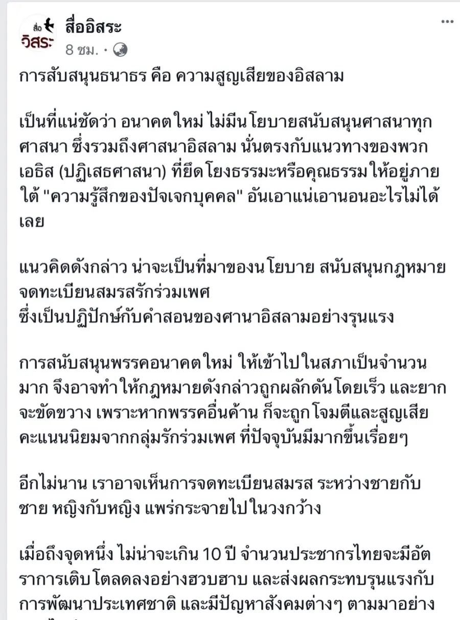 เพจสื่อโพสต์ เรื่องราวการสนับสนุนธนาธร คือ ความสูญเสียของอิสลาม