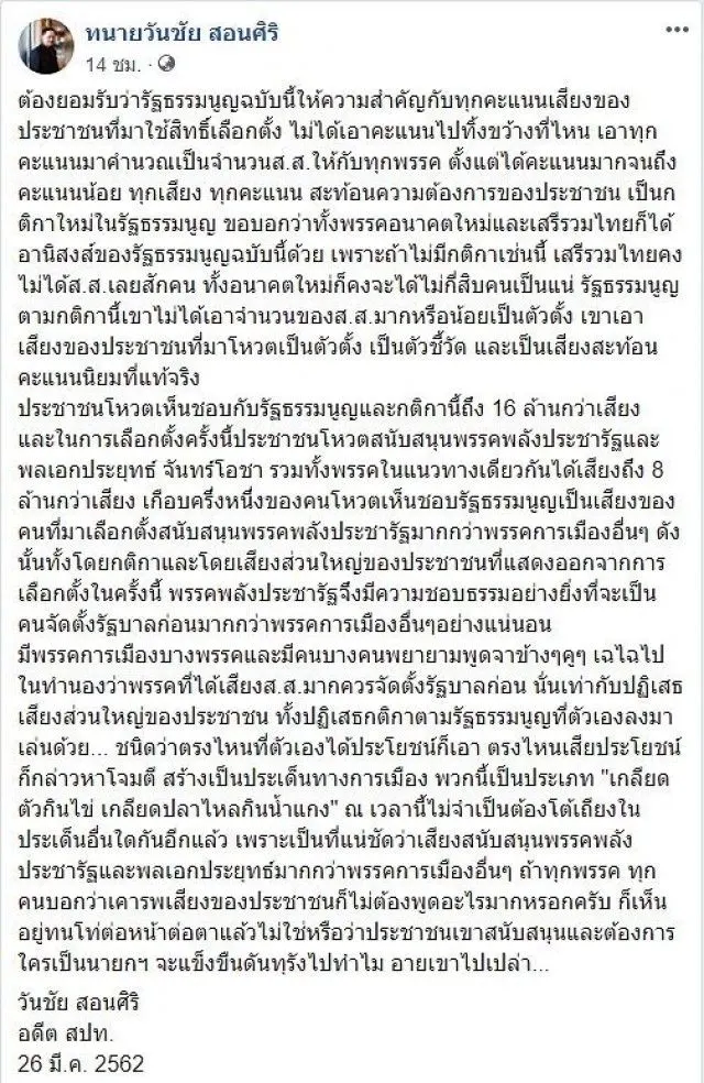 เรียกได้ว่าการแข่งขันทางการเมืองในขณะนี้ กำลังเข้มข้นเป็นอย่างมาก และถึงแม้ว่าทางพรรคเพื่อไทยจะได้มีการจับมือกับพันธมิตรจัดตั้งรัฐบาล แต่ทางด้าน "ทนายวันชัย" ก็ได้มีการออกมาเคลื่อนไหวโพสต์เหตุผลที่ว่า พลังประชารัฐก็มีสิทธิโดยชอบธรรมจัดตั้งรัฐบาล โดยได้มีการระบุว่า