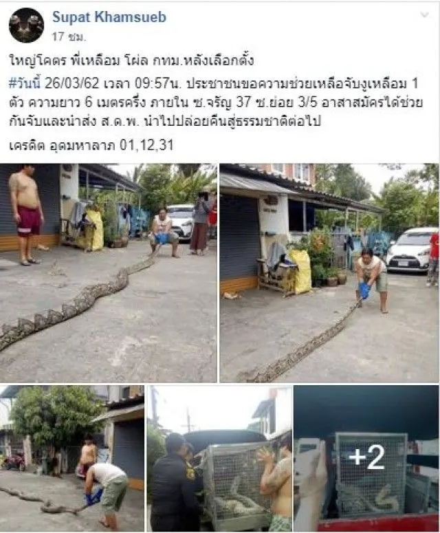ใหญ่โคตร พี่เหลือม โผ่ล กทม.หลังเลือกตั้ง #วันนี้ 26/03/62 เวลา 09:57น. ประชาชนขอความช่วยเหลือจับงูเหลือม 1 ตัว ความยาว 6 เมตรครึ่ง ภายใน ซ.จรัญ 37 ซ.ย่อย 3/5 อาสาสมัครได้ช่วยกันจับและนำส่ง ส.ด.พ. นำไปปล่อยคืนสู่ธรรมชาติต่อไป