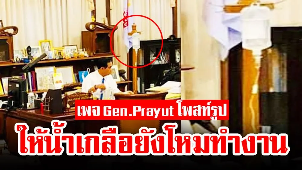 วันนี้ 28 มีนาคม 2562 เพจเฟซบุ๊ก Gen.Prayut Chan-o-cha ทีมงาน ได้โพสต์ภาพ พล.อ.ประยุทธ์ จันทร์โอชา นายกรัฐมนตรีและหัวหน้าคณะรักษาความสงบแห่งชาติ (คสช.) ภายในห้องทำงาน โดยโพสต์ภาพดังกล่าวได้ซูมไปถุงน้ำเกลือที่ห้อยอยู่ด้านหนึ่งของ พล.อ.ประยุทธ์ ในแคปชั่นที่ว่า