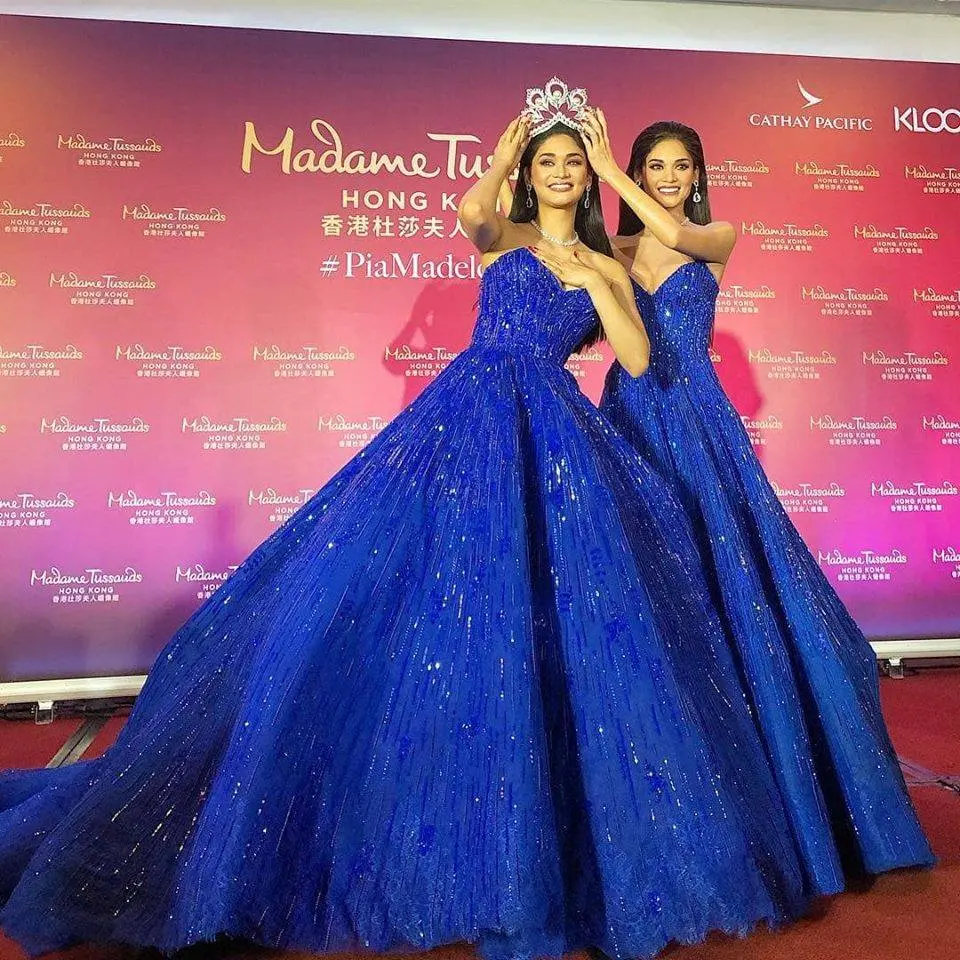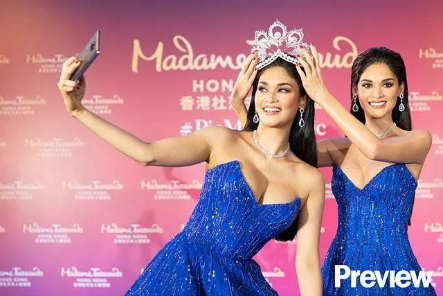 เปีย MissUniverse 2015 กับหุ่นขี้ผึ้งที่ ที่มาดามทุสโซ่ สาขาฮ่องกง ในท่ายื่นมิกิโมโตะ สวยและเหมือนจริงสุดๆ