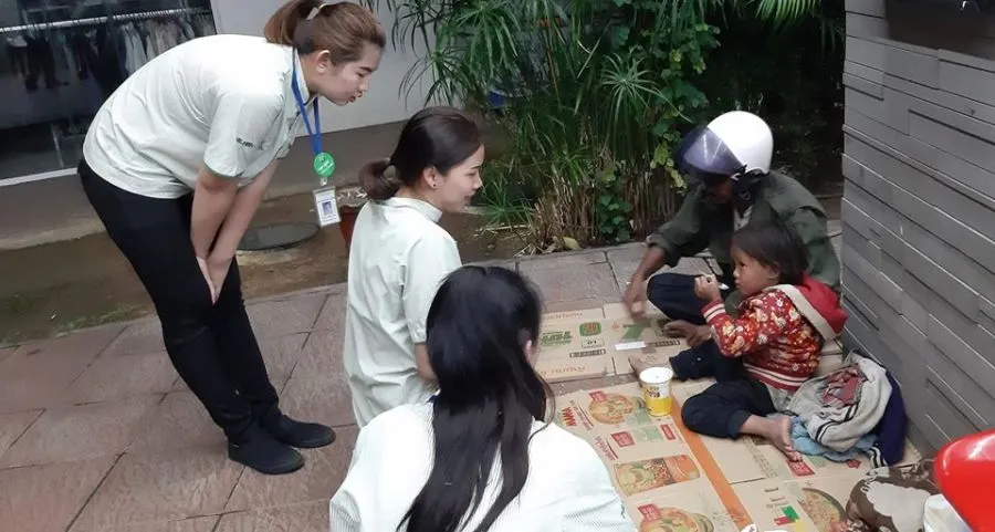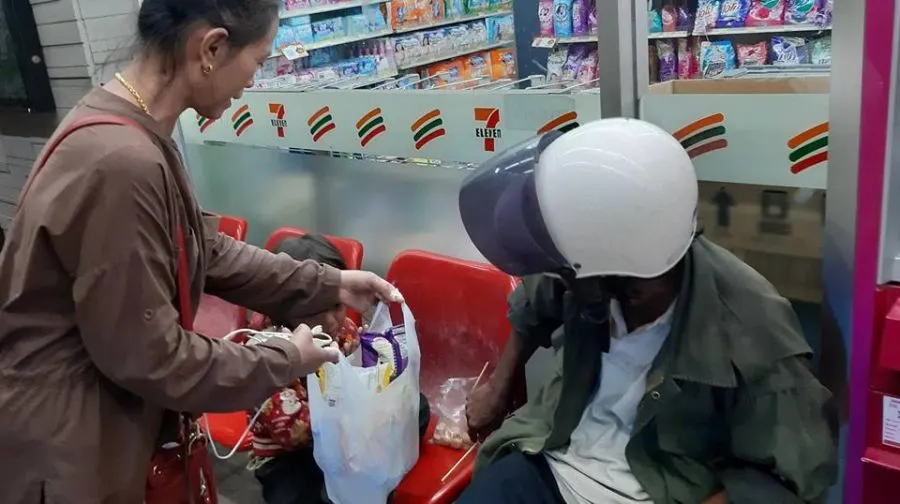 โดยพนักงานสาว 7-11 ได้แสดงออกถึงน้ำใจ นำกระดาษลังมาจัดเป็นที่นอนให้ พร้อมนำข้าวต้มมาให้ตากับหลานได้รับประทาน