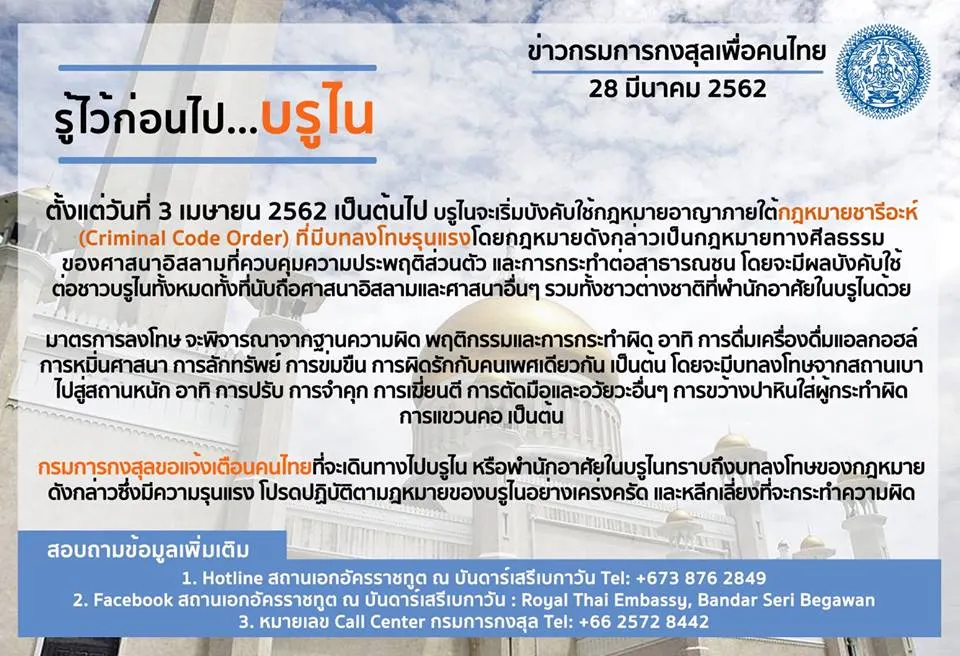 ล่าสุด 28 มีนาคม 2562 เพจ กรมการกงสุล กระทรวงการต่างประเทศ ได้ออกประกาศเตือนคนไทยที่กำลังเดินทางไป และพำนักอยู่ที่บรูไน แล้ว