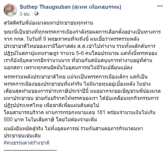 เมื่อ วันที่ 28 มีนาคม 2562 นายสุเทพ เทือกสุบรรณ ผู้ร่วมก่อตั้งพรรครวมพลังประชาชาติไทย (รปช.) ได้โพสต์ข้อความผ่านทาง Facebook ของตนเอง ระบุว่า สวัสดีครับพี่น้องมวลมหาประชาชนทุกท่าน ขณะนี้เป็นช่วงที่ทุกพรรคการเมืองกำลังรอผลการเลือกตั้งอย่างเป็นทางการจาก กกต. ในวันที่ 9 พฤษภาคม ที่จะถึงนี้ ผมเชื่อว่าพรรครวมพลังประชาชาติไทยของเรามีโอกาสส่ง ส.ส. เข้าไปทำงาน รวมทั้งผลักดันการปฏิรูปในสภาผู้แทนราษฎร จำนวน 5-6 คนโดยประมาณ