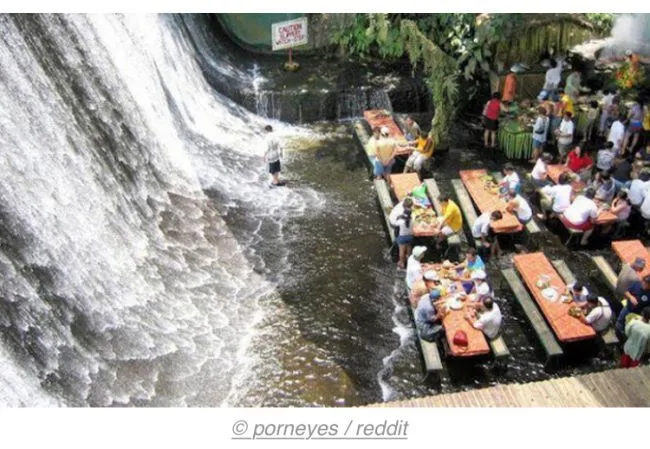 Villa Escudero Resort เป็นรีสอร์ทที่สวยงามในฟิลิปปินส์ใกล้กับเมือง San Pablo และร้านอาหารตั้งอยู่ในน้ำตก! ผู้มารับประทานอาหารต้องนั่งในน้ำ แต่ไม่จำเป็นต้องกังวล ปลอดภัยเพราะความลึกแค่เพียง 20 เซนติเมตรเท่านั้น