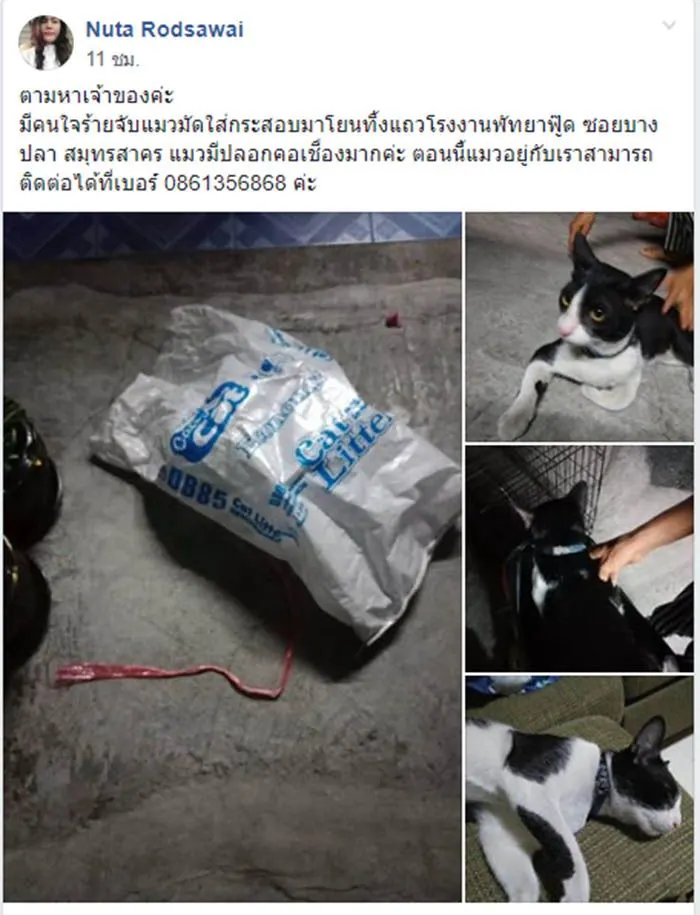 เป็นอีกภาพจากคนรักสัตว์ ที่เผยแพร่ในโซเชียล เพื่อประกาศตามหาเจ้าของแมว หลังพบว่าคนใจร้ายนำแมวใส่ถุงกระสอบโยนทิ้งแถวโรงงาน จ.สมุทรสาคร