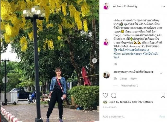 วันที่ 29 มี.ค. ทูลกระหม่อมหญิงอุบลรัตนราชกัญญา สิริวัฒนาพรรณวดี ทรงโพสต์ข้อความในอินสตาแกรมส่วนพระองค์ nichax ว่า ต้นคูนต้นใหญ่ดอกสวยพวงใหญ่มากๆ ดูแล้วสดชื่น แล้วยังมีดอกเฟื่องฟ้าสีสวยๆเพราะนางชอบอากาศร้อนๆ แดดเยอะๆ มีเยอะแยะเหมือนกันที่ San Diego, California (แถวบ้านเก่าดิฉัน) และที่ Mexico ก็มี ส่วนรูปกล้วยก็แอบเป็นนางตานีซะหน่อย เดินเหนื่อยเสร็จก็ไปเติมพลังที่ Amazon เจ้าเดิมซะหน่อย #รีแล็กซ์วันละนิดจิตแจ่มใส #Don_tWorryBeHappy #ไม่เป็นไรฉันโอเค