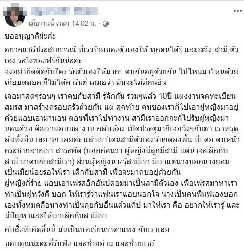 วานนี้่ (31/03/2562) ในโลกออน์ไลน์ได้เผยแพร่เรื่องราวของหญิงสาวคนหนึ่ง โดยผู้ใช้ชื่อเฟซบุ๊กท่านหนึ่ง (ขอสงวนนาม) ได้เล่าประสบการณ์สามีนอกใจ โดยระบุว่า ขออนุญาติน่ะค่ะ อยากแชร์ประสบการณ์ ที่เรวร้ายของตัวเองให้ ทุกคนได้รู้ และระวัง สามี ตัวเอง ระวังของฟรีกันน่ะค่ะ จงอย่ายืดติดกับใคร รักตัวเองให้มากๆ คบกันอยู่ด้วยกัน ไปไหนมาไหนด้วยเกือบตลอด ก็ไม่ได้การันตี เสมอว่า มันจะไม่มีคนอื่น