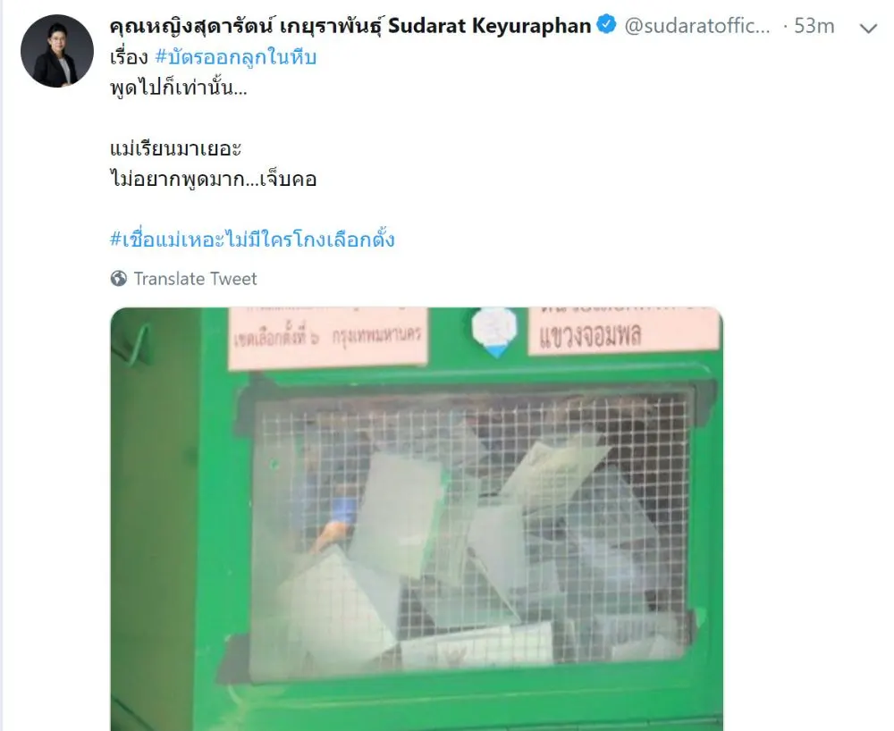 ล่าสุดทางด้าน คุณหญิงสุดารัตน์ เกยุราพันธุ์ ประธานยุทธศาสตร์การเลือกตั้งพรรคเพื่อไทย ได้ทวีตข้อความในทวิตเตอร์ส่วนตัว เกี่ยวกับกรณีนี้ว่า เรื่อง #บัตรออกลูกในหีบ พูดไปก็เท่านั้น… แม่เรียนมาเยอะ ไม่อยากพูดมาก…เจ็บคอ #เชื่อแม่เหอะไม่มีใครโกงเลือกตั้ง
