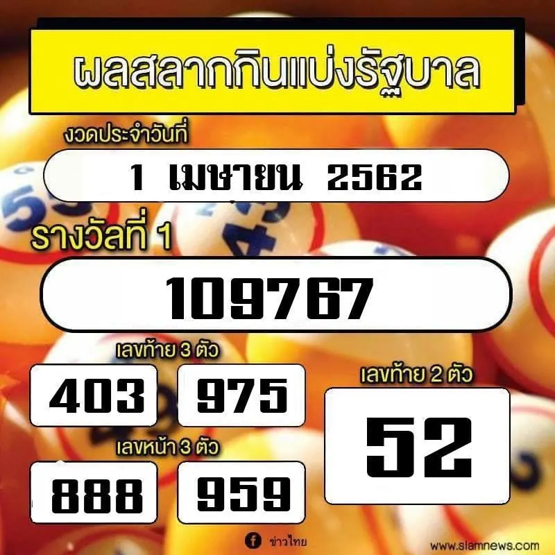 ผลสลากกินแบ่งรัฐบาล งวดวันที่ 1 เมษายน 2562