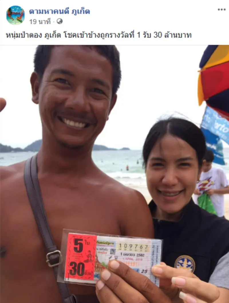 โดยมีผู้โชคดีถูกรางวัลที่ 1 แล้วในงวดนี้ โดยเพจ ตามหาคนดี ภูเก็ต ได้โพสต์ภาพระบุข้อความว่า หนุ่มป่าตอง ภูเก็ต โชคเข้าข้างถูกรางวัลที่ 1 รับ 30 ล้านบาท