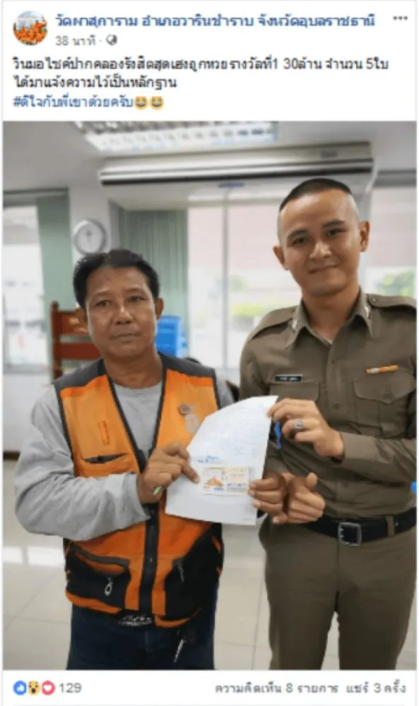 ล่าสุดมีผู้ใช้เฟสบุ๊คชื่อ วัดผาสุการาม อำเภอวารินชำราบ จังหวัดอุบลราชธานี ได้ออกมาโพสต์ภาพผู้โชคดีถูกรางวัลที่ 1พร้อมทั้งได้ระบุข้อความว่า… วินมอเตอร์ไซค์ปากคลองรังสิตสุดเฮงถูกหวยรางวัลที่1 30ล้าน จำนวน 5ใบ ได้มาแจ้งความไว้เป็นหลักฐาน #ดีใจกับพี่เขาด้วยครับ
