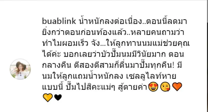 น้ำหนักลงต่อเนื่อง..ตอนนี้ลดมายิ่งกว่าตอนก่อนท้องแล้ว..หลายคนถามว่าทำไมผอมเร็ว จัง…ให้ลูกทานนมแม่ช่วยคุณได้ค่ะ บอกเลยว่าบัวปั๊มนมมีวินัยมาก ตอนกลางคืน ตีสองตีสามก็ตื่นมาปั๊มทุกคืน! มีนมให้ลูกแถมน้ำหนักลง เซลลูไลท์หายแบบนี้ ปั๊มไปสิคะแม่ๆ สู้ค่า