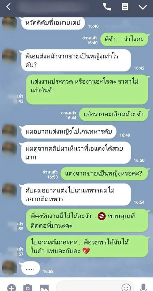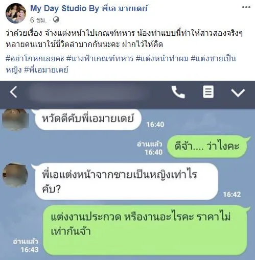 ล่าสุด เฟซบุ๊กเพจ My Day Studio By พี่เอ มายเดย์ ช่างแต่งหน้าชื่อดัง ได้ออกมาแฉพฤติกรรมของชายรายหนึ่ง ที่ทักไลน์มาจ้างให้แต่งหน้าแปลงโฉมจากชายเป็นหญิง เพื่อหลีกเลี่ยงการจับใบดำใบแดงในการเกณฑ์ทหาร โดยทางเพจได้ระบุว่า