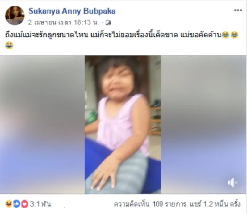 เมื่อวันที่ 2 เมษายน ที่ผ่านมา ผู้ใช้เฟสบุ๊คที่ใช้ชื่อว่า Sukanya Anny Bubpaka ได้โพสต์คลิปสุดฮาของลูกสาวที่ไม่อยากไปโรงเรียน โดยคุณแม่นั้นบอกว่าเดี๋ยวแม่จะส่งให้ไปเรียนหมอ สาวน้อยคนนี้ก็ร้องไห้สนั่นลั่นบ้าน บอกหนูบ่อยากเป็นแม่ แม่เลยถามว่าแล้วหนูอยากเป็นอีหยัง พอตอบมาเท่านั้นแหละ หนูอยากเป็นควาย งานนนี้ทำเอาคุณแม่ถึงกับกุมขมับทันทีค่ะ โดยผู้ใช้เฟสบุ๊ครายนี้ได้ระบุข้อความว่า...
