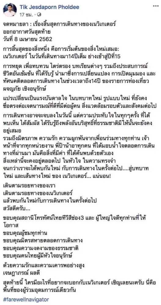 แฟนๆใจหาย "ติ๊ก เจษฎาภรณ์" ประกาศสิ้นสุดการเดินทาง อำลาจอ "เนวิเกเตอร์" หลังอยู่มา 14 ปี !
