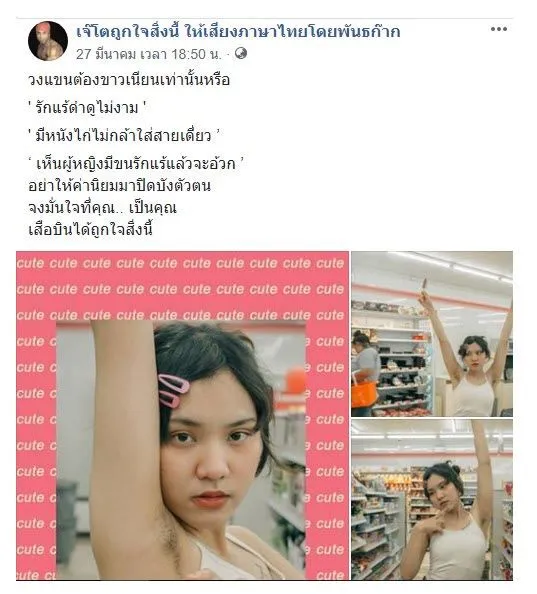 อย่างเช่นเมื่อไม่นานมานี้เพจเฟสบุ๊กที่มีชื่อว่า “เจ๊โตถูกใจสิ่งนี้ ให้เสียงภาษาไทยโดยพันธก๊าก” ได้เผยแพร่ภาพหญิงสาวคนหนึ่งสวมใส่เสื้อเดี่ยวและยกแขนขึ้นโชว์ขนสวยๆ อย่างมั่นใจ และย่านที่เธอยกแขนโชว์ก็เป็นที่สาธารณะมีผู้คนเดินไปมาอีกด้วย ถ้าไม่มั่นใจทำไม่ได้นะจ๊ะแบบนี้ จะเป็นยังไงนั้น ลองไปชมภาพกันดีกว่า