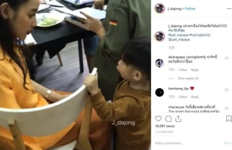 โดยเมื่อแม่แพท ถามลูกชายว่า เจอเพื่อนป๊า น้องเรซซิ่งก็บอกว่า เจอ แม่แพท ถามอีกว่า แล้วเจอผู้หญิงมั้ย ลองไปฟัง น้องเรซซิ่ง ตอบว่า ยังไง แม่แพท ถึงกับร้องร้องเสียงดังเลยจ้า