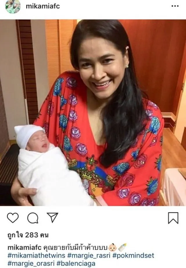 เรียกได้ว่าออกมาลืมตาดูโลกเป็นที่เรียบร้อยแล้วสำหรับฝาแฝดหมื่นล้าน มีก้า และ บีญ่า ลูกฝาแฝดของนักแสดงสาว มาร์กี้ ราศี และสามีนักร้องหนุ่ม ป๊อก ภัสสรกรณ์ ท่ากลางความยินดีของคนในวงการและแฟนๆ ต้องบอกเลยว่าหน้าตาน่ารักน่าชังมากคนหนึ่งเหมือนพ่อคนหนึ่งเหมือนแม่ ล่าสุดนี้ แม่เหน่ง คุณยายของสองฝาแฝด คุณแม่ของ มาร์กี้ ราศี ก็ได้มาเยี่ยมและเห็นหน้าหลานฝาแฝดเป็นครั้งแรก งานนี้ก็ไม่พลาดที่จะสอน มาร์กี้ เลี้ยงลูกด้วยต้องบอกเลยว่าอบอุ่นมาก